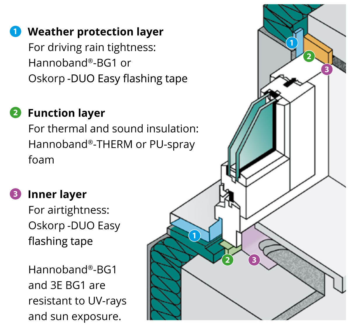 Ideal for an easy and reliable sealing of windows and doors during any weather, the „all-in-one“ multi- functional tapes are the optimum choice. Their „moisture-adapting“ membranes ensure that the joint can dry out all year. These highly innovative tapes provide an excellent thermal, sound, air and rain barrier. After their installation, the polyurethane soft foam expands in the joint and provides a durable joint sealing. Movements of building components – e. g. linked to temperature changes – are compensated even after many years.